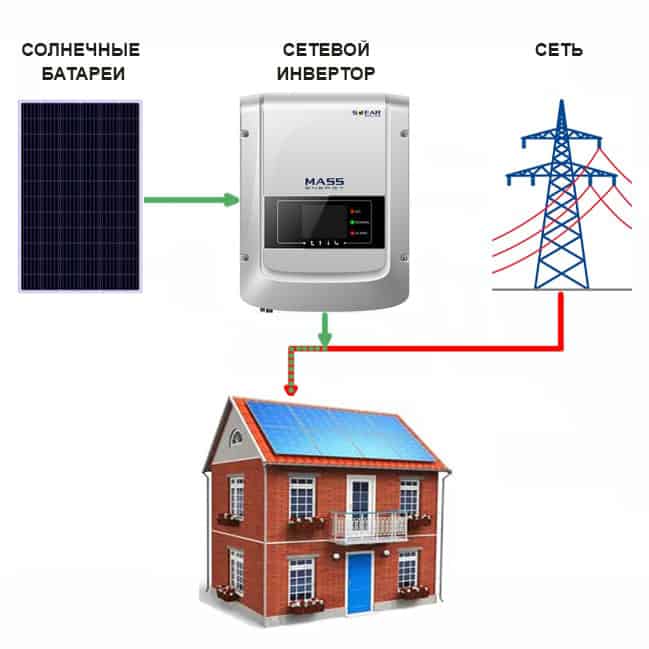 Сетевая солнечная электростанция состоит только из солнечных модулей и сетевого инвертора - аккумуляторы не требуются. В СЭС используется метод прямого преобразования солнечного излучения в электрическую энергию с ее последующей подачей в вашу электросеть. Система предназначена для уменьшения потребляемой энергии от центральной электросети, а также увеличения ее суммарной мощности. СЭС работает одновременно с вашей сетью, добавляя сгенерированную ею энергию на питание нагрузки.
